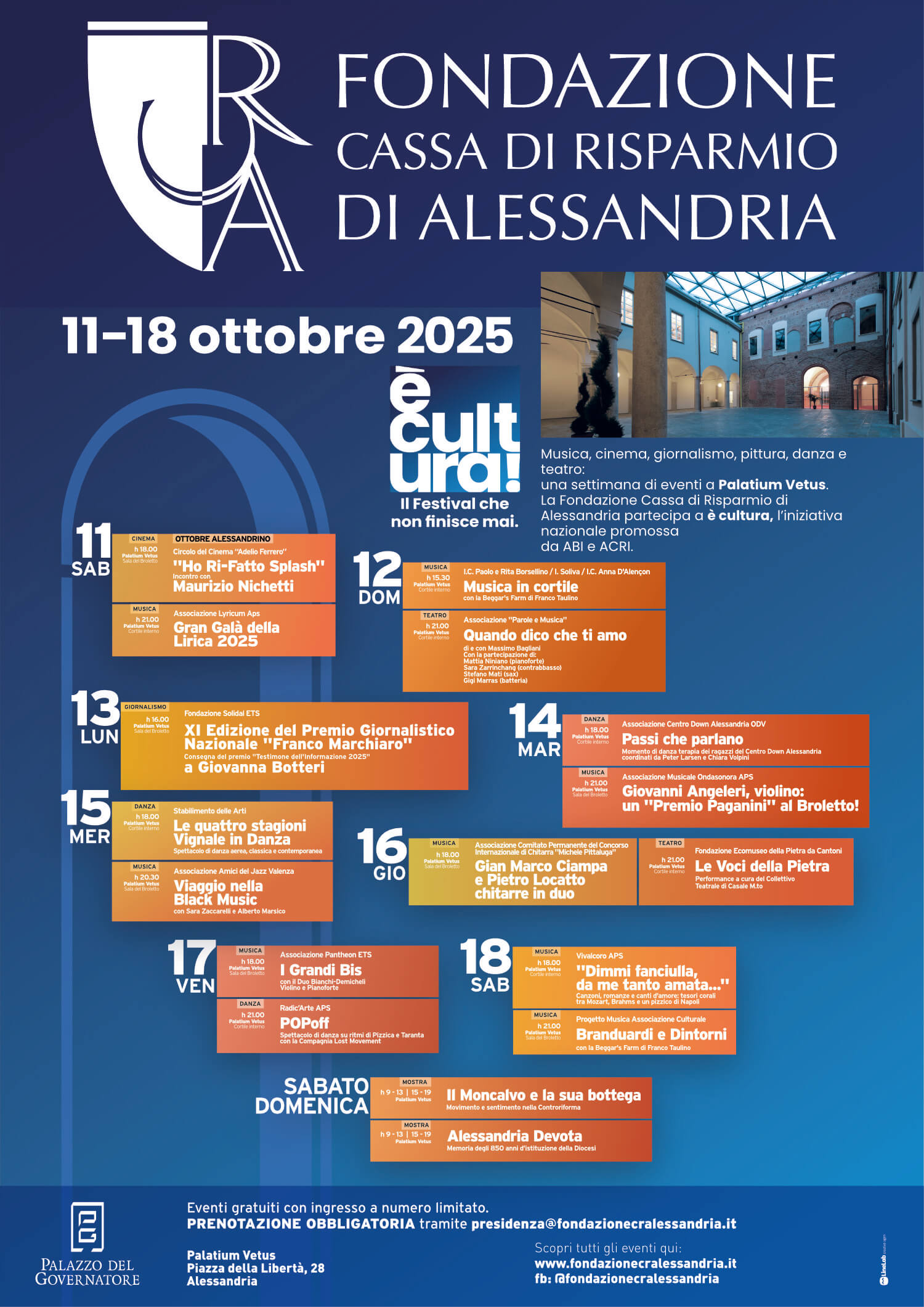 Alessandria, 2 ottobre 2025 – Dall’11 al 18 ottobre, il festival È CULTURA ritorna a Palatium Vetus con un ricco programma di eventi che spazieranno dal cinema alla musica, dalla danza al teatro, dalla pittura al giornalismo.