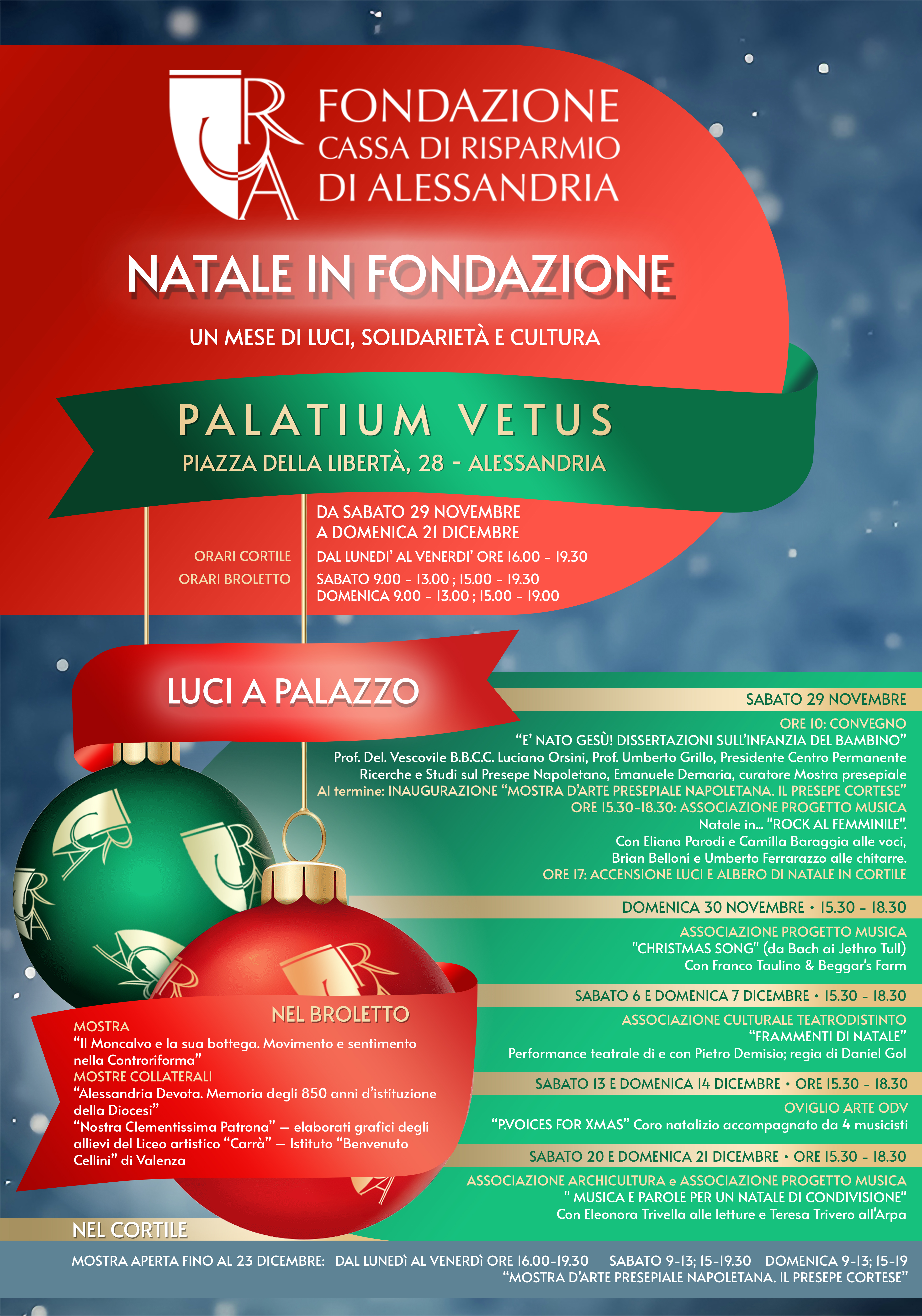 Alla luce del successo riscosso lo scorso anno dall’evento, la Fondazione Cassa di Risparmio di Alessandria ha deciso di riproporre l’iniziativa con un ricco calendario di appuntamenti che spaziano dai presepi napoletani, al grande albero di Natale allestito nel cortile interno, dai convegni ai concerti, dalle performance teatrali, ai cori natalizi, alla grande mostra di opere del Moncalvo, ai tesori di “Alessandria Devota”. Il Palazzo con la sua storia e il suo patrimonio culturale sarà a disposizione del pubblico: il Broletto, la Quadreria e la Ghiacciaia saranno visitabili gratuitamente, con guida su prenotazione.